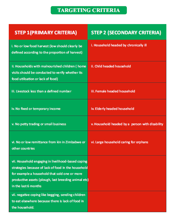 Geographic targeting at national level Geographic/district targeting for FDMS is guided by result of the national assessments conducted by the Zimbabwe Livelihood Assessment Committee (ZimLAC), triangulated with information from district profiles, poverty assessments, the Consolidated Approach of Reporting Indicators for food security (CARI), and other relevant secondary information such as the Crop and Livestock Assessments. In a year where ZimLAC conducts an Integrated Phase Classification (IPC) Analysis, the findings can also be used to triangulate ZimLAC results. The ZimLAC determine the current rural population that is food insecure and projects the likely progression of food insecurity by district and number of people per consumption year. This includes spatial and temporal distribution as well as severity of food insecurity by quarter.